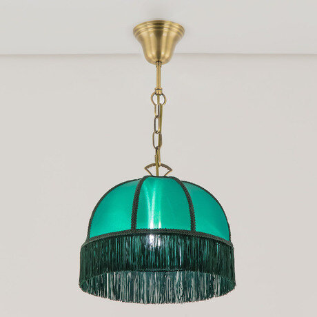 Уютный подвесной светильник Citilux Базель CL407112 выполнен в классическом стиле. Основание металлическое, благородного бронзового цвета. Тканевый винтажный абажур зелёного цвета декорирован оригинальной ажурной тесьмой и искусно обшит бахромой.
