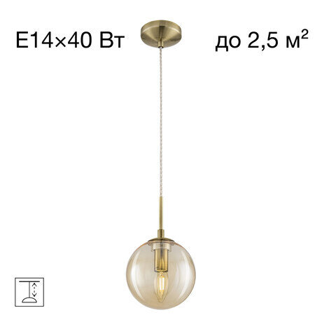 Подвес Citilux Томми CL102013 с одним плафоном. Основание светильника металлическое, круглой формы, цвет бронза. Плафон стеклянный в форме шара, прозрачный с тонировкой оттенка шампань (золотистый), высота подвеса легко регулируется. В светильнике используется 1 лампа с цоколем Е14 мощностью 40Вт (в комплект не входит, приобретается отдельно). Площадь освещения около 2,5 кв. метров. Модель подходит для всех типов потолков, в том числе натяжных. Тип крепления – планка. Подвесной светильник отлично подходит для помещений с высокими потолками. Великолепно выглядит над прикроватной тумбочкой, в зоне стола или над стойкой бара.Citilux CL102 TOMMY: Вдохновение в каждом луче.