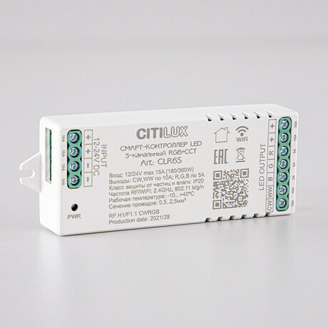Умный Смарт Контроллер Citilux CLR6S является компонентом экосистемы CITILUX SMART. После подключения и настройки, используя домашние сети WiFi, добавляет возможность легко управлять любой светодиодной лентой со смартфона или планшета, через приложение CITILUX SMART, а также голосовыми помощниками Алиса от Яндекс и Маруся от mail.ru. Доступно управление пультом и обычным настенным выключателем.Работает как с 12 вольтовыми, так и с 24-х вольтовыми лентами. Контроллер имеет 5 диммируемых каналов. Два канала по 10А для основного света и три канала по 5А для цветной (RGB) подсветки. Одновременная работа основного света и RGB недоступна. Мощность 2-цветной ленты основного света можно подключить: при использовании ленты на 12В – до 180 Вт; лента на 24 В – до 360Вт.Внимание: для настройки данного контроллера необходим пульт дистанционного управления Citilux CLR5G (не входит в комплект, приобретается отдельно или в комплекте с другими светильниками экосистемы Citilux);