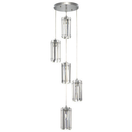 Подвесной хрустальный светильник Citilux Джейн CL306051 выполнен в современном стиле. Он имеет металлическое основание круглой формы и глянцевое хромированное покрытие. Особенностью данной модели являются пять хрустальных подвесных плафонов, ниспадающие изящным каскадом. Каждый плафон цилиндрической формы, крупные хрустальные элементы кристально прозрачные с современной огранкой.