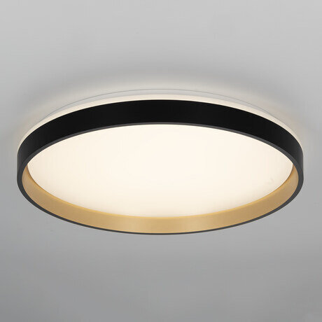 Светодиодный потолочный светильник Citilux ENZO CL753511G с яркой цветной RGB подсветкой выполнен в современно стиле. Основание металлическое. Плафон круглой формы из прочного полимера чёрного цвета с золотой декоративной окантовкой и рассеивателем из оптического полимера. Благодаря оригинальной конструкции, светильник равномерно освещает помещение и мягко подсвечивает потолок, что придаёт пространству дополнительный объём.