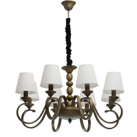 Производитель: MW-Light; Коллекция: Вирджиния; Количество ламп: 8; Мощность лампы, W: 40; Общая мощность, W: 320; Площадь освещения, м2: 17,8; Тип лампочки (основной): Накаливания; Тип цоколя: E14; Напряжение, V: 220; Степень защиты, IP: 20; Виды материалов: Текстильные; Материал арматуры: Металл; Материал плафонов: Ткань; Цвет: Белый; Цвет арматуры: Бронза; Цвет плафонов: Белый; Место установки: На потолок.